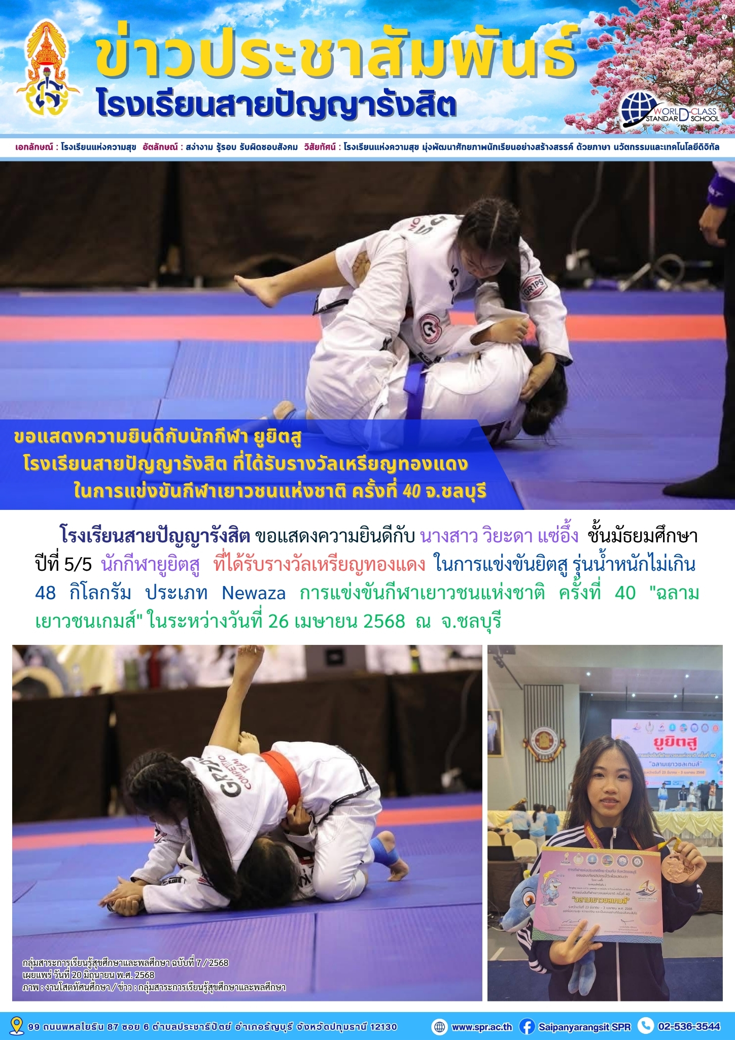 ขอแสดงความยินดีกับนักกีฬายูยิตสู โรงเรียนสายปัญญารังสิต ที่ได้รับรางวัลเหรียญทองแดง ในการแข่งขันกีฬาเยาวชนแห่งชาติ ครั้งที่ 40 จ.ชลบุรี