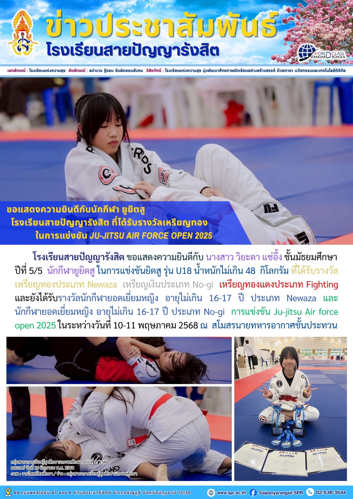 ขอแสดงความยินดีกับนักกีฬายูยิตสู โรงเรียนสายปัญญารังสิต โรงเรียนสายปัญญารังสิต ที่ได้รับรางวัลเหรียญทอง ในการแข่งขัน Ju-jitsu Air force open 2025