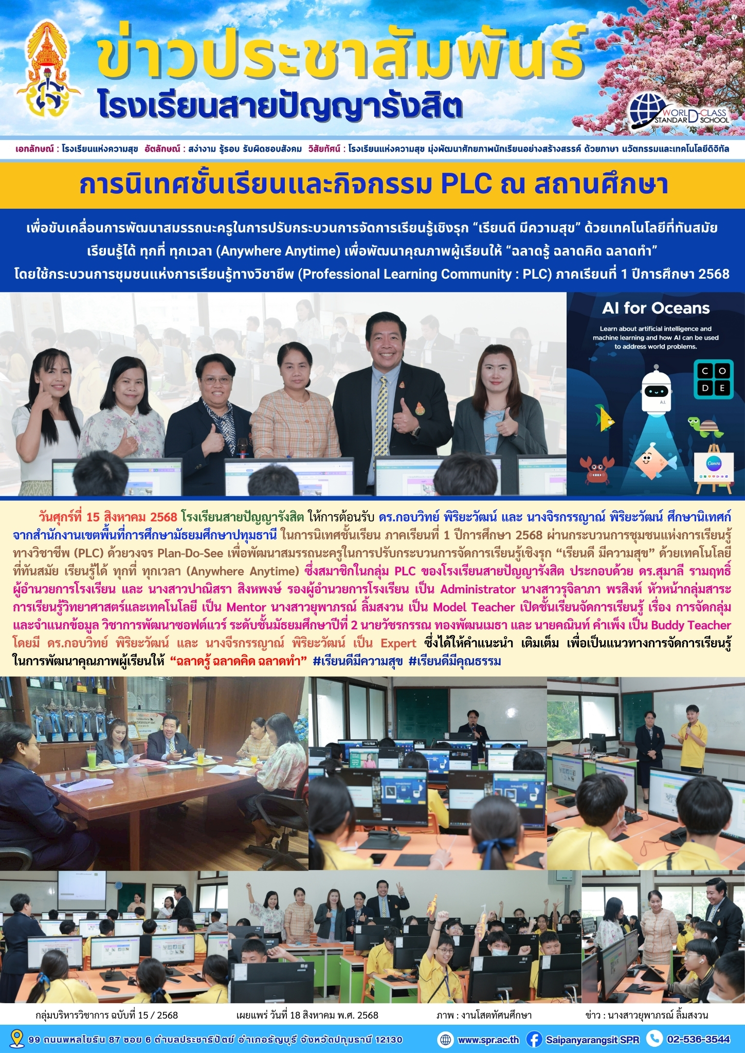การนิเทศชั้นเรียนและกิจกรรม PLC ณ สถานศึกษา เพื่อขับเคลื่อนการพัฒนาสมรรถนะครูในการปรับกระบวนการจัดการเรียนรู้เชิงรุก “เรียนดี มีความสุข” ด้วยเทคโนโลยีที่ทันสมัย เรียนรู้ได้ ทุกที่ ทุกเวลา (Anywhere Anytime) เพื่อพัฒนาคุณภาพผู้เรียนให้ “ฉลาดรู้ ฉลาดคิด ฉลาดทำ” โดยใช้กระบวนการชุมชนแห่งการเรียนรู้ทางวิชาชีพ (Professional Learning Community : PLC) ภาคเรียนที่ 1 ปีการศึกษา 2568