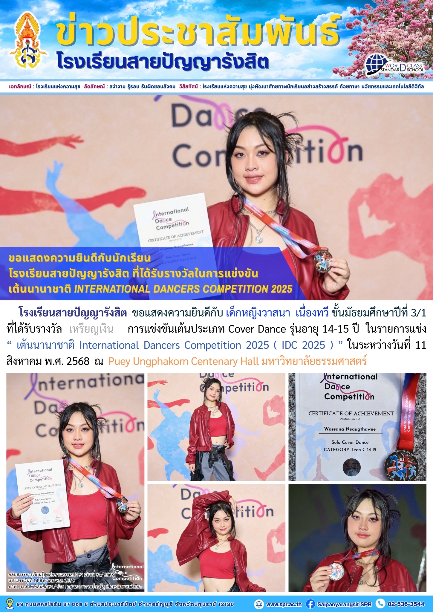 ขอแสดงความยินดีกับนักเรียน โรงเรียนสายปัญญารังสิต ที่ได้รับรางวัลในการแข่งขันเต้นนานาชาติ International Dancers Competition 2025