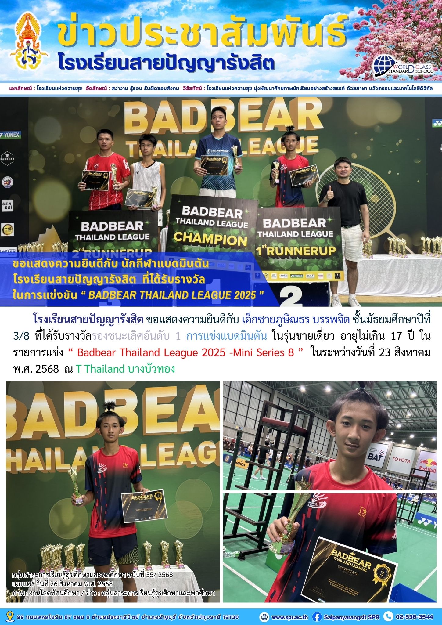 ขอแสดงความยินดีกับ นักกีฬาแบดมินตัน โรงเรียนสายปัญญารังสิต ที่ได้รับรางวัล ในการแข่งขัน “ Badbear Thailand League 2025 ”